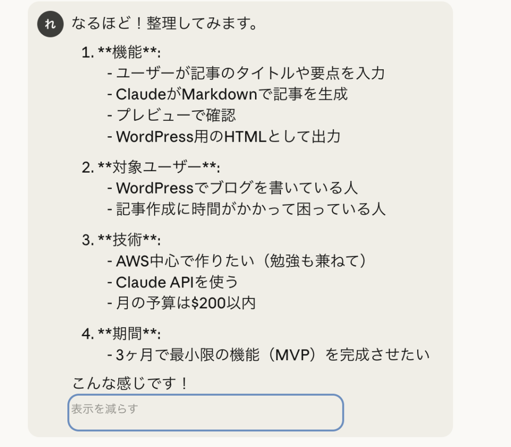 - Claudeが質問してくるので、それに答えていけば自然と整理される